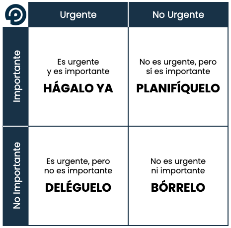 Luego, debemos ordenar nuestras responsabilidades según la prioridad. Podemos determinar qué componentes del proyecto son los más importantes y luego concentrarnos en ellos en orden de prioridad. La Matriz de Eisenhower1 podría ser una herramienta útil para ello. Divide los trabajos en cuatro cuadrantes según su importancia y urgencia.