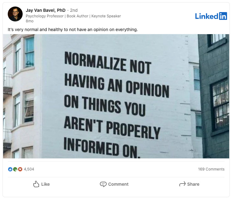 Vivimos en tiempos donde la información es abundante y la presión para tener una opinión sobre cada tema es inmensa. Las redes sociales, foros y plataformas de comunicación digital nos bombardean constantemente con noticias, opiniones y debates. Nos sentimos obligados a participar, a demostrar que estamos informados y a opinar sobre cada asunto, desde los más triviales hasta los más complejos. Sin embargo, como nos recuerda el doctor Van Bavel, no siempre estamos debidamente informados para comentar sobre todo.